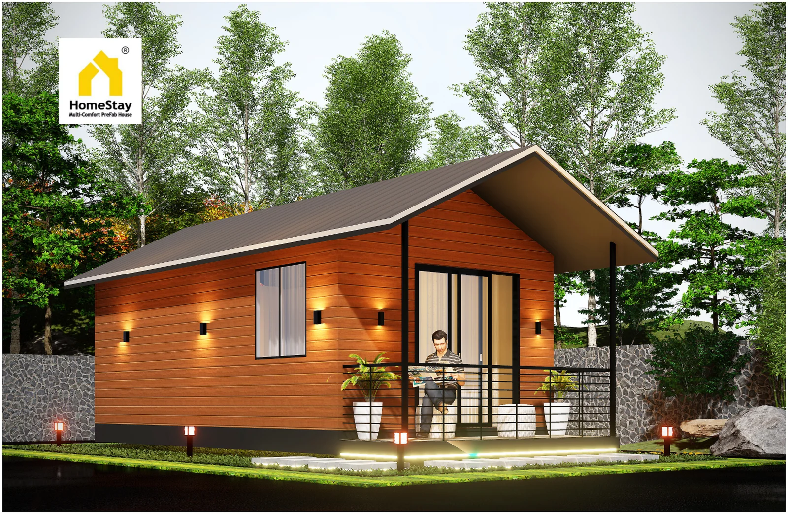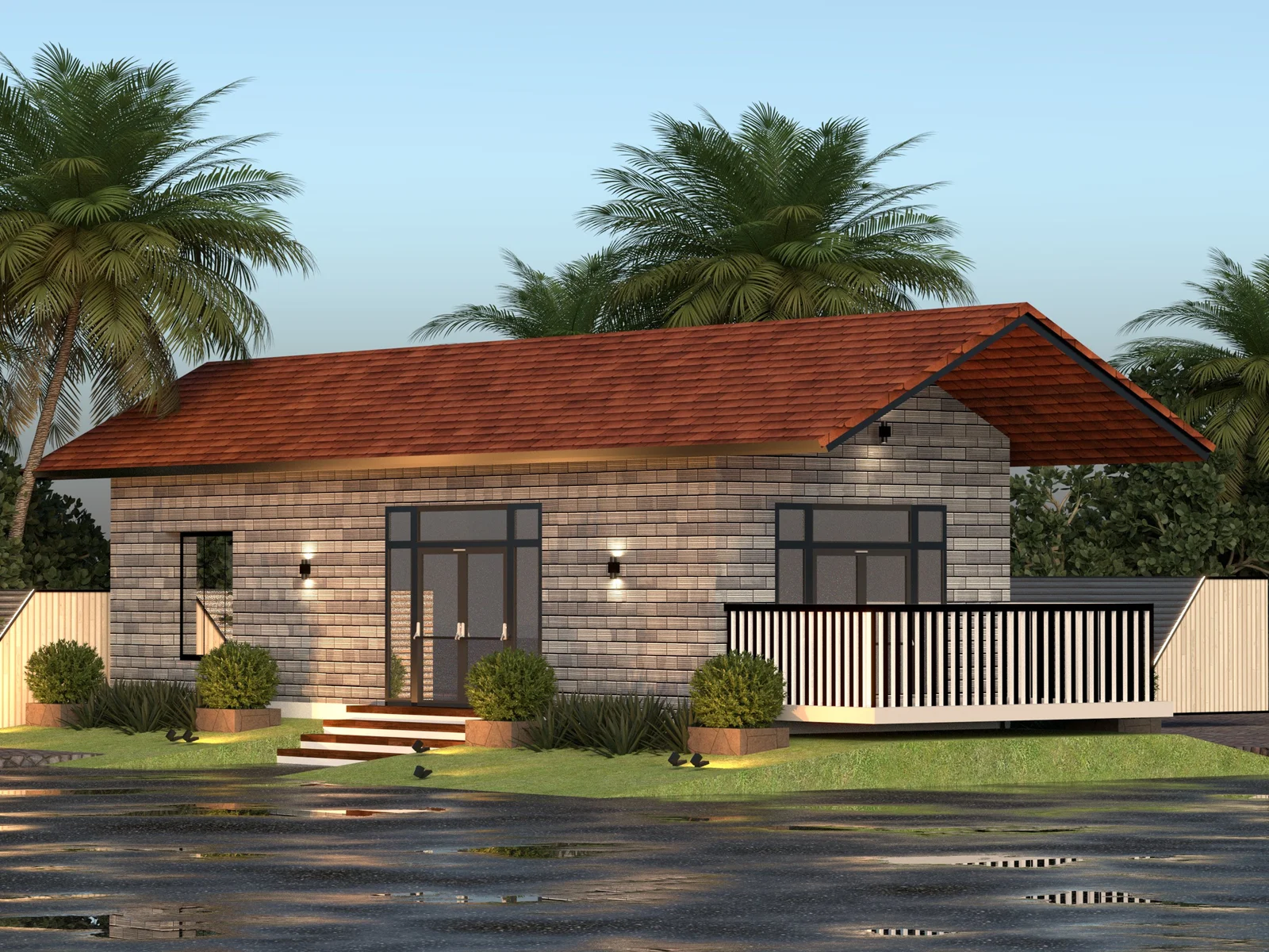 This prefab unit is designed with a strong MS steel structure, insulated wall and roof panels, and high-quality materials to ensure durability, comfort, and energy efficiency. It features UPVC windows and doors, modern vinyl flooring, a complete electrical setup, and a fully equipped modular bathroom with premium fittings. The use of insulated panels and sturdy construction provides long-lasting performance, weather protection, and comfortable living. Perfect for modern residential or resort-style prefab spaces.
